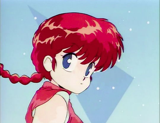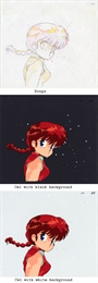 Ranma-chan is swinging her head, throwing off water droplets. This occurs right after Akane throws a bucket of water on Ranma-chan, chnaging him to his female form. The white water drops are visible around her head. The blue background used here is a non-matching copy background that was supplied with the cel.