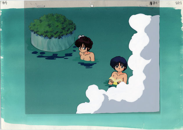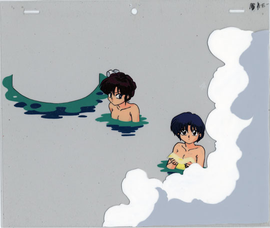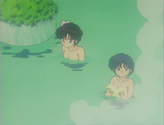 Ranma 1/2 OAV Series Disc 3 DVD Title 1 45:53 A nude Ukyo and a nude Akane (what other way is there to take a bath?) are in the non-communal baths at the rest stop in the caves. Very convenient for getting the girls naked. Yes, every cave system in the world always has an underground public bath! Anyways, Akane is saying that she is wondering if Ryoga will catch up with them.