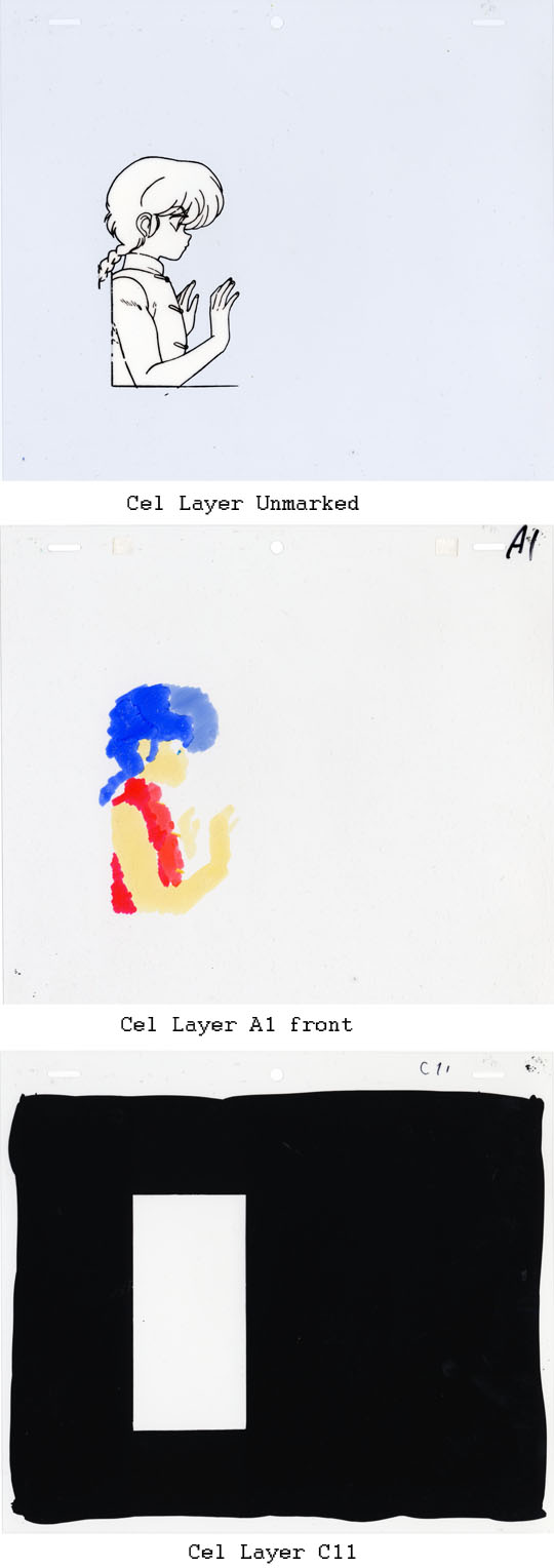 There are four separate cel layers. The bottom layer has a pure white paper cutout attached to the back with trace lines on an unmarked layer. A blank layer is above the bottom layer. The A1 layer is colored with markers on the front and is placed above the other two layers. The C11 layer is the rectangular box created by an all black area with a box cutout..