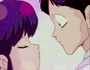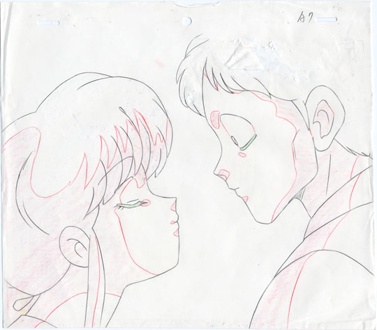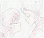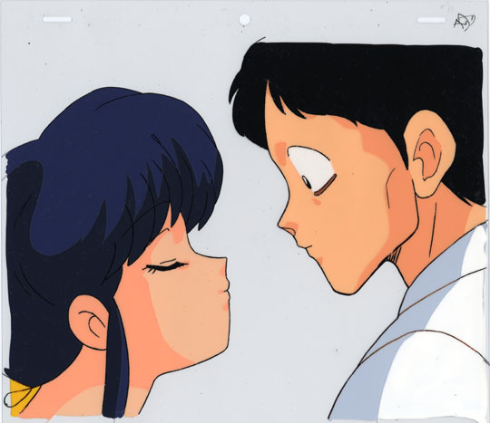 This image is from a daydream of Gosunkugi's. Gosunkugi is imaging first a date with Akane and later being married to Akane. This cel occurs at the point in his daydream when he is returning home from work and Akane is greeting him with a kiss.