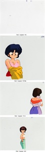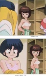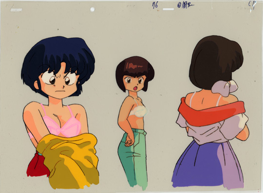 Since very few of the multi-layer cels that I have are not stuck together, I have taken the opportunity below to show all of the cel layers separately just because I can. The screens captures show two times: Kasumi earlier in the pan just visible on the right (7:20) and Akane and Nabiki later (7:22).