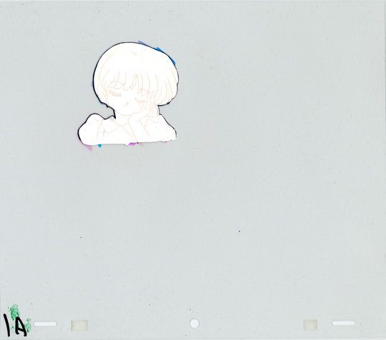 This cel is colored with markers on the front. The back of the cel is pure white with the trace lines. The back of the cel is shown in the image below.