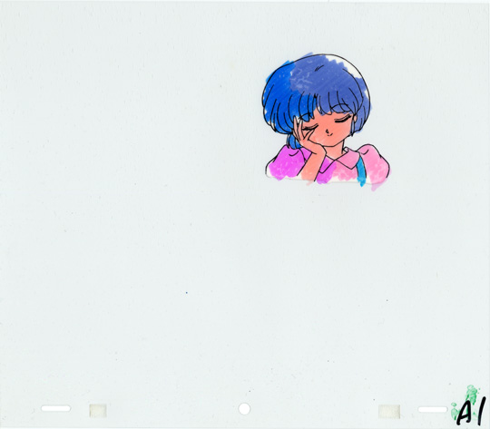Akane is resting her head on her hand with her eyes closed. She is enclosed in a square that drifts across the screen from left to right until it halts, leaving this cel on the screen a full six seconds. Then Akane lifts her head and opens her eyes.