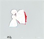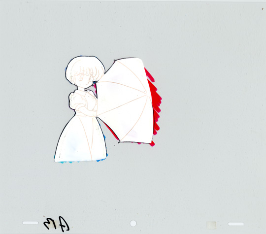 This cel is colored with markers on the front. The back of the cel is pure white with the trace lines. The back of the cel is shown in the image below.