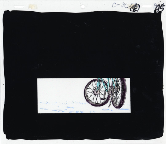 The C12 layer is black with the rectangular cutout. The C-3 layer is the water droplets. The B-1 layer is the blue color on the bike. The A5 End layer is the white bicycle. The phone booth must be on a layer that is missing.