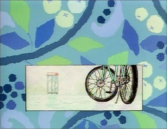 The end sequence consists of a series of brief views inside different rectangles. The sequences are: 1. 0:00->0:19 Bicycle in vertical rectangle 2. 0:20->0:32 Akane in square drifting across screen 3. 0:37->0:43 Ranma with hands up in a vertical rectangle on the left side 4. 0:43->0:52 Bicycle in horizontal rectangle 5. 0:52->1:06 Akane in vertical rectangle on right walking with umbrella 6. 1:06->1:14 Akane legs walking in horizontal rectangle to Ranma legs 7. 1:14->1:20 Left-side vertical rectangle with Akane holding umbrella and right-side vertical rectangle with Ranma-chan 8. 1:20->1:29 Horizontal rectangle with Akane holding umbrella out, facing Ranma-chan on right 9. 1:29 Hearts background with "Thank you" in middle.