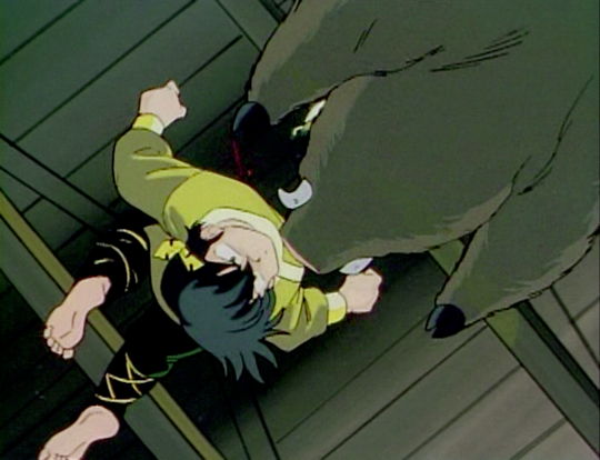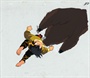 Ryoga Hibiki is in a cabin trying to write a letter to Ranma when he is interrupted by a noise caused by a boar attacking the door. In this cel, the boar attacks as Ryoga does a flip into the air. The background is the roof of the cabin.