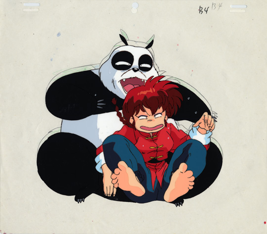 Ranma's mom, Nodoka Satome, draws a sword from its scabbard in response to Akane's question about whether Nodoka would insist on Genma and Ranma committing ritual seppuku if Genma failed to live up to his promise to make Ranma into a man among men. The punch line to this action is that Nodoka lets the sword slip from her grasp and it lands embedded in the floor in front of Ranko (Ranma-chan) and Genma panda. Here, in this cel, the sword is in the air and Ranma-chan and Genma panda are reacting in terror as the sword heads towards its final impact location in front of them between Ranma-chan's legs.