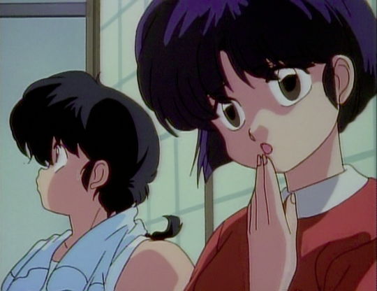 Akane is trying to question Ranma about the markings that are on both Ryoga's and P-chan's chests. Ranma is avoiding the discussion.