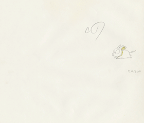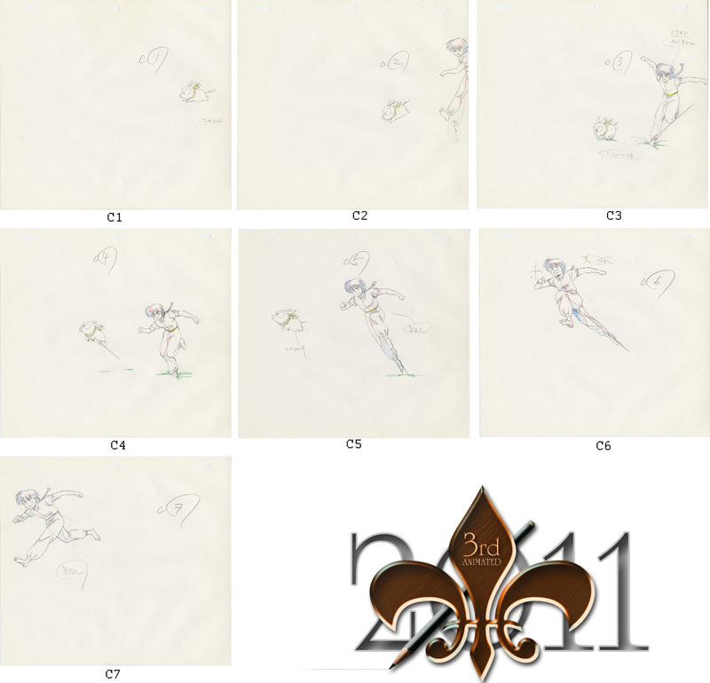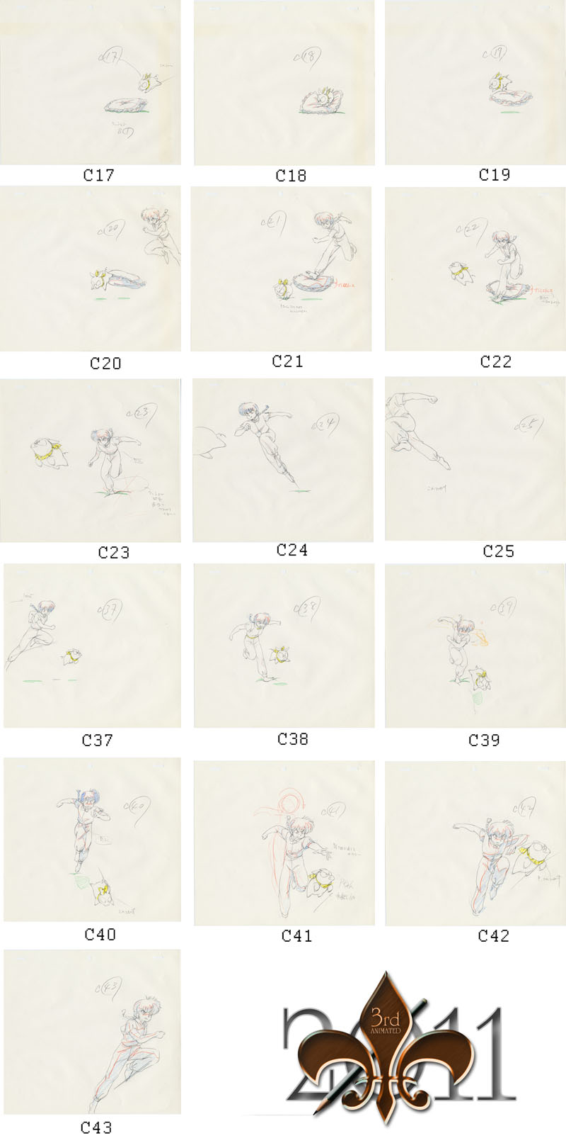 Description: Kodachi has just attacked Akane in her bedroom and is about to hit her with a mallet when P-chan bursts through the door with Ranma in pursuit, smashing Kodachi behind the door. The sequence of genga covers Ranma's chase of P-chan back and forth across Akane's bed. In the video, genga C1 through C32 are repeated with C33 through C43 covering the final exit from the room.
