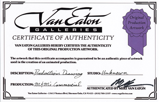 This is a drawing of the blue regular "m" spokes-candy from an m&m's commercial. The Van Eaton Galleries certification of authenticity does not identify the studio that produced the drawing.