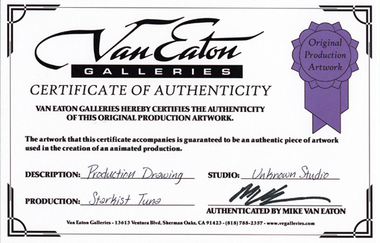 This is a drawing of Charlie the Tuna from a Starkist Tuna commercial. The Van Eaton Galleries certification of authenticity does not identify the studio that produced the drawing.