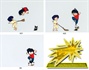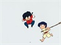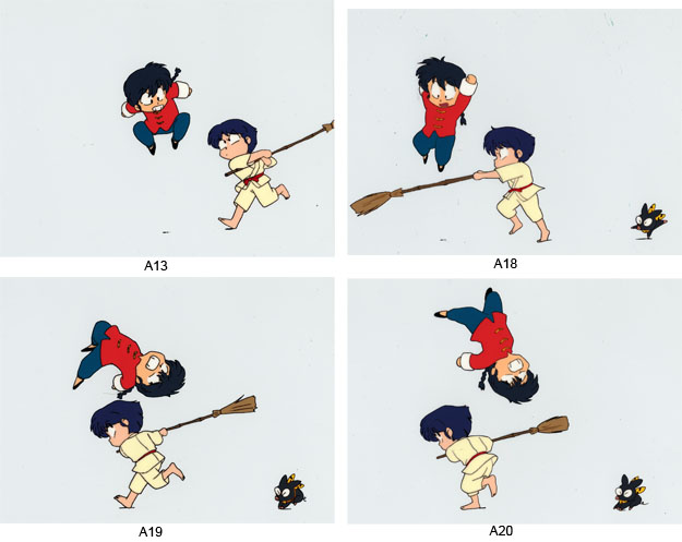 Description: This is the eyecatch used for Ranma 1/2 Nettohen episodes 1 - 117. These cels are from the eyecatch that occurs before the commercial break and shows Akane chasing Ranma with a broom. Ranma does a backflip to avoid being hit and lands squarely on the unfortunate P-chan, who has followed Akane as she has chased after Ranma.