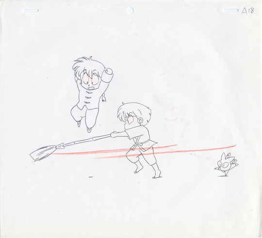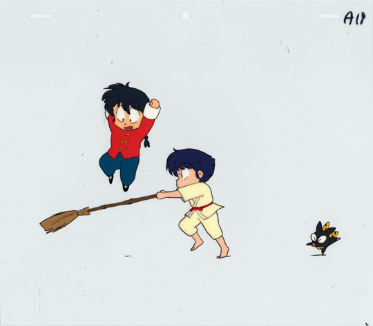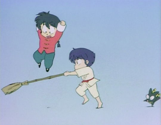 Akane is taking her second swing at Ranma with the broom as he jumps up to avoid being hit with the broom.