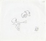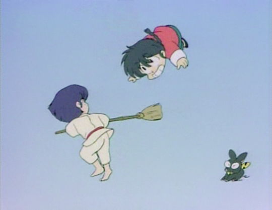 Akane has finished taking her second swing at Ranma with the broom. Here, he is heading down after doing a backflip with a big grin on his face.