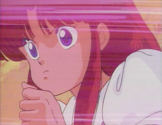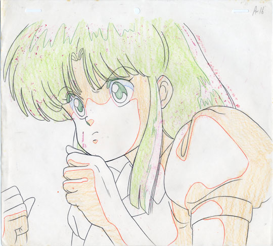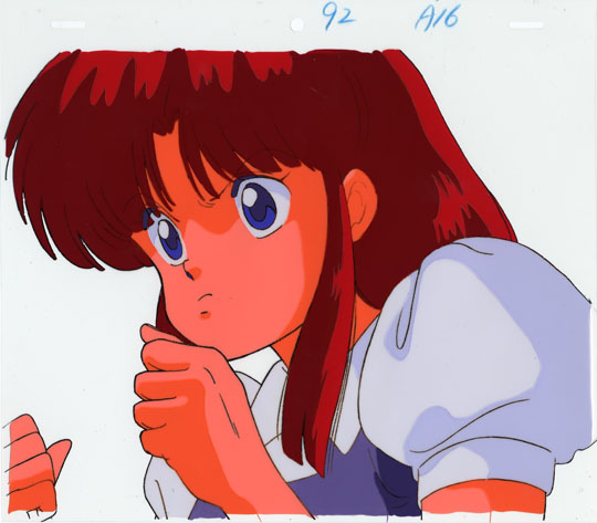 Akane is picking up Ryoga's umbrella as Ranma and Ryoga fight on the school athletic field when she realizes its weight means Ryoga is exceptionally strong. The scene tints red as Akane thinks about the implications.