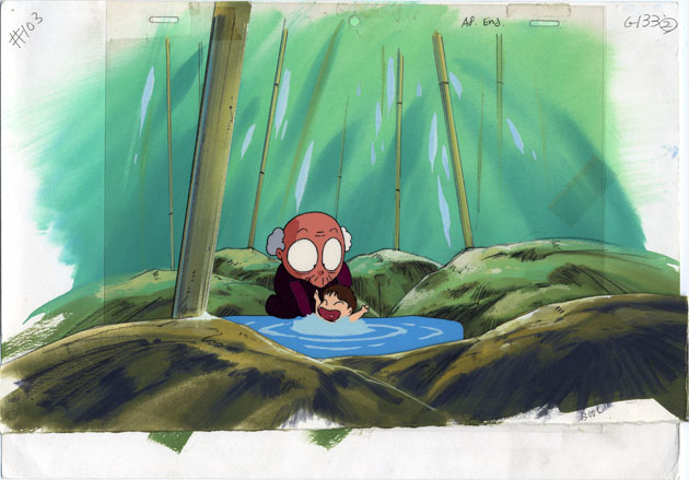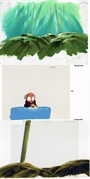 This is a book cel. The prior owner attached the foreground to a clear cel sheet. The background, cel, and foreground are shown separately in the left image below.