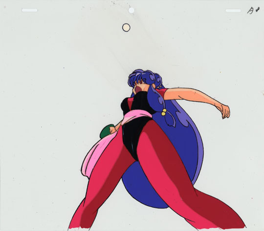 Akane is playing ping-pong against Shampoo. Shampoo has hit two previous exploding ping pong balls at Akane that have burst and sent out various traps to hold Akane. Akane has broken loose from chains released by the first and is still caught in the sticky threads from the second. Here, in this cel, Shampoo is about to hit a third ball at Akane.