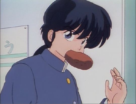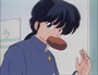 In a flashback, Ranma relates his first meeting with Ryoga at school. Here, Ranma is holding the last curry bread of the day in his teeth. Ranma has just snagged it after the school lunch lady has tossed it into the crowd of students vying for the food. Ryoga is asking who Ranma is.