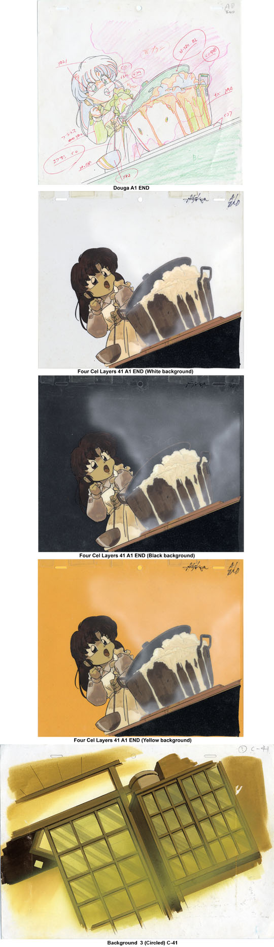 Below: Douga, cel only with white, black, & yellow backgrounds, and background alone and Screen capture