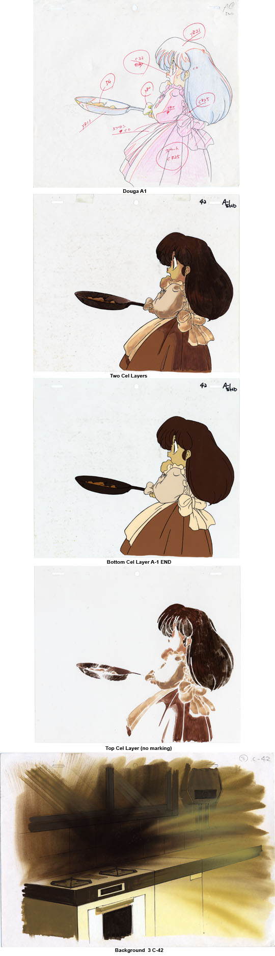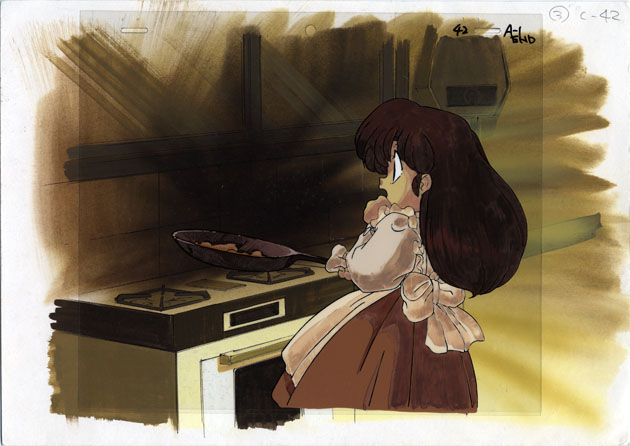 Kasumi is holding her mother's recipe book. As she closes her eyes, she recalls her experiences learning to cook. She says that, at first, everything seemed to go wrong. Then a series of cels appears showing different cooking catastrophes. This flashback cel appears as the second in the series, showing the contents of the skillet catching on fire. There is only this one cel in the sequence. I don't have the cel layer with the flame.