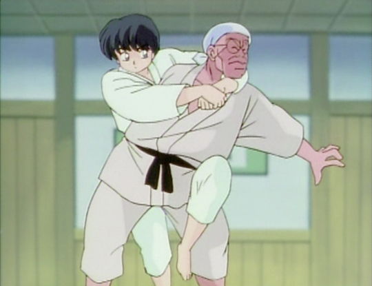 Ranma and Genma are sparring in the Tendo Dojo. Genma is begging Ranma to let him go. Ranma is saying that people are blaming him for stuff that Genma is actually responsible for. This scene occurs just before a flashback to Ryoga's encounter with the Jusenkyo springs.
