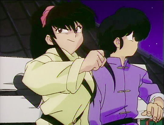 Ukyo and Ranma are sitting on a bench on the Tendo dojo roof, as arranged by Nabiki. Here, Ukyo is reacting to the presence.of others, specifically Shampoo, but also Kodachi. Ukyo is telling them to go, that this is Ukyo's time to be alone with Ranma.