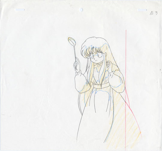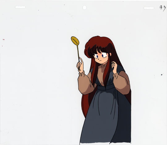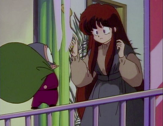 Midori, the kindergarten teacher, confronts Happosai on the balcony of her apartment. Happosai is about to steal Midori's pantyhose hanging outside when she accosts him. Happosai denies he is about to steal her pantyhose.