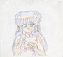 Shampoo is preparing for a party at the Cat Cafe during which Cologne intends to trick Ranma into declaring his love for Shampoo. In this cel, Shampoo has just finished applying her lipstick and has put it back in its case, which is in her hand. This cel is supposed to be the mirror image of Shampoo as she examines herself in the mirror.