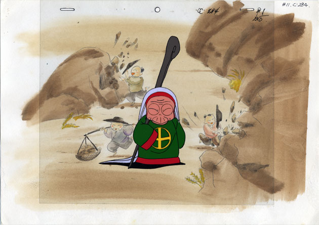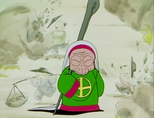 Cologne explains that the Bakusai Tenketsu (Breaking Point) Attack she has taught Ryoga only works against objects, not people. Cologne makes her explanation against a static sepia background of Chinese miners shown in various mining-related activities.