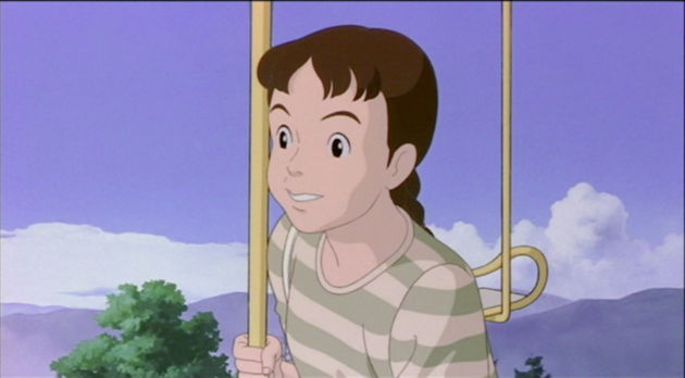 Here, Taeko Okajima is riding on a ski lift chair. She is talking to Toshio, who is in the chair in front of her.