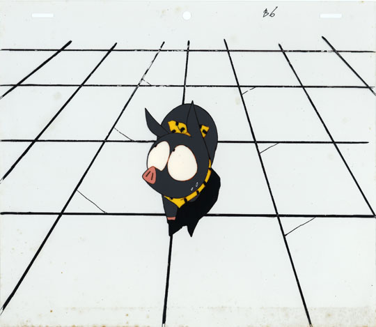 After a confrontation between Ranma and Ryoga on the high school athletic field, Ryoga transforms back to P-chan and disappears. The scene cuts to Akane searching for P-chan. Then, the scene shifts to a street scene showing P-chan walking alone down the street as passer-bys remark about the cute black pig. In this cel, P-chan is looking about as he walks along. This is followed by scene of P-chan sitting on a bridge rail overlooking a stream.