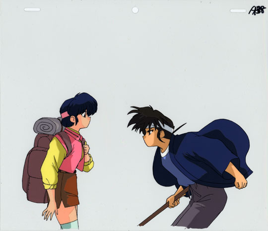 Upon returning to the forests of Ryugenzawa, Akane remembers the boy she met on her childhood vacation to those forests; and, as she does so, she is surprised by a giant platypus. Shinnosuki then knocks out the platypus, tells Akane to leave, and jumps down off the head of the platypus. In this cel, Shinnosuke is landing on the ground at the conclusion of the jump. He then proceeds to fall into one of the monster traps that he was warning Akane about. She then remembers that exactly the same thing happened when the boy rescued her when she was young on her previous family vacation to the forests.