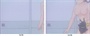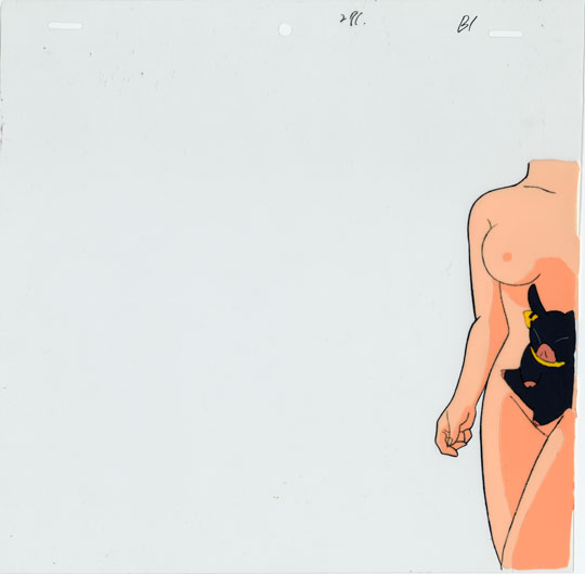 Here, in this cel, the scene opens with a naked Ranma-chan holding an equally naked P-chan as they enter the bathroom. This cel, the B1 cel, is photographed so that only the slightest bit of P-chan appears on the screen. The screen capture below shows the B1 cel and the later B4 cel, just to reveal all in their full nude glory.
