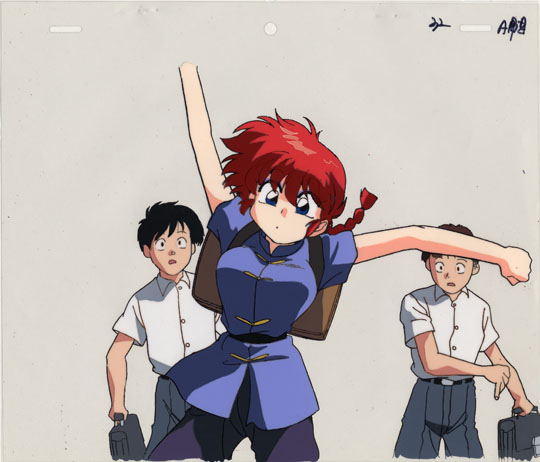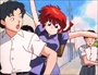 Ranma-chan rushing down the street past two school boys. This sequence occurs almost at the very end of the opening..