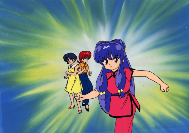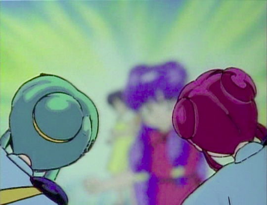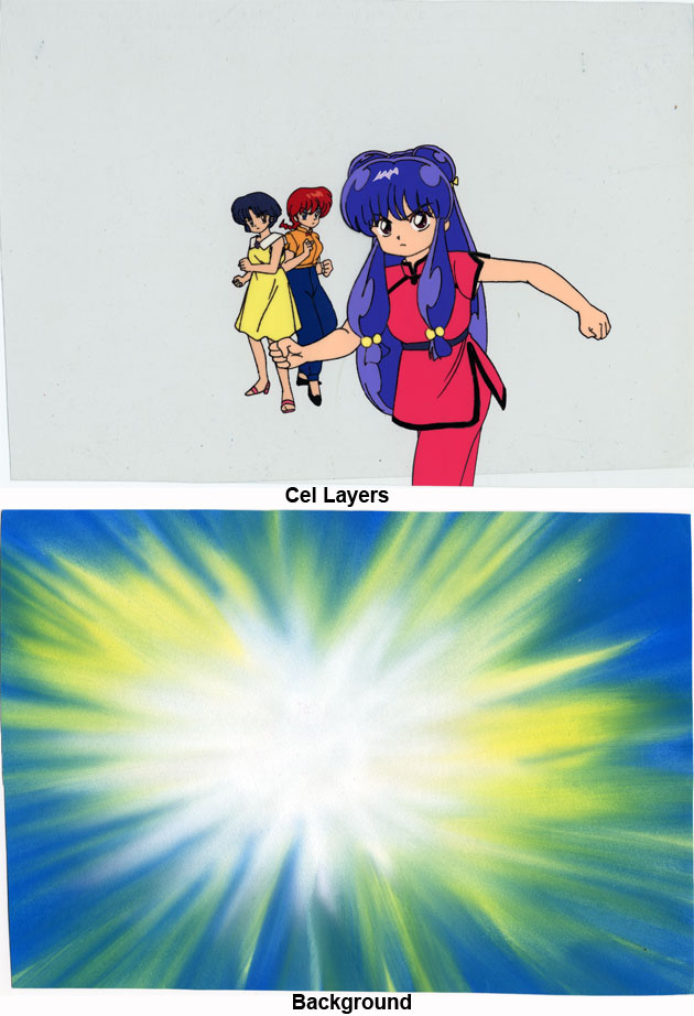 The amazon women Ling-Ling and Lung-Lung are moving toward Akane and Ranma-chan to attack them when Shampoo intervenes, stepping between the Amazon women and Akane and ranma-chan. The cels are imaged out of focus. The background alternates between two different color patterns.