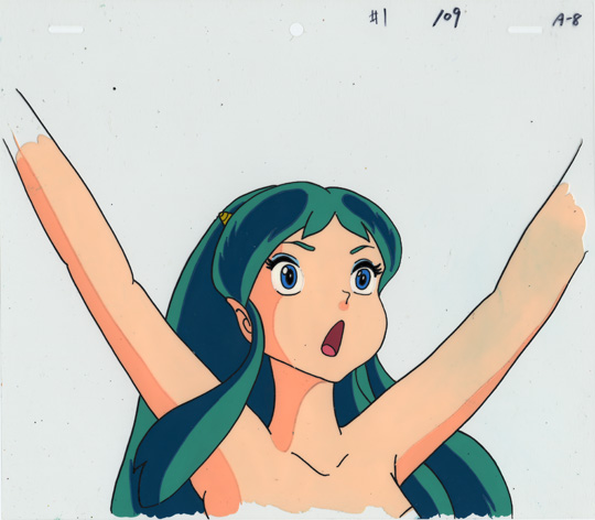 On the first day of the tag contest to determine the fate of Earth, Lum jumps into the air when Ataru attempts to grab her. This cel shows Lum flying up and away.