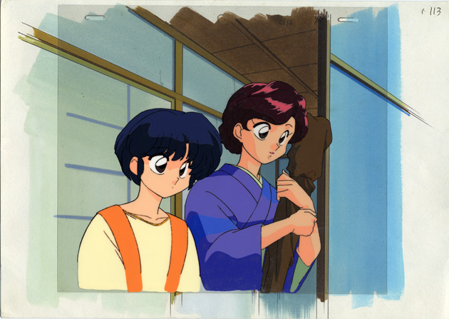 Akane stands next to Nodoka Satome, Ranma's mom, who is holding her ever-present wrapped sword. Mrs. Satome left the Tendo household but returned, telling Akane that she can't believe she forgot her sword when she left the first time.