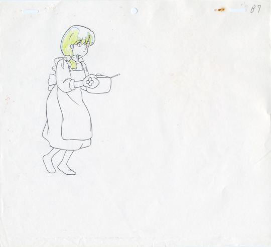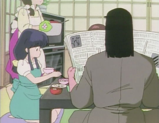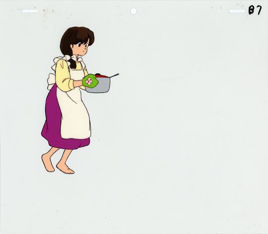 Kasumi in a purple skirt, yellow blouse, and a white apron is carrying a pot using oven mitts. In this cel, Kasumi is in the background behind Akane as she carries the pot to the table and sits down with Akane, Nabiki, and Soun.