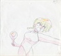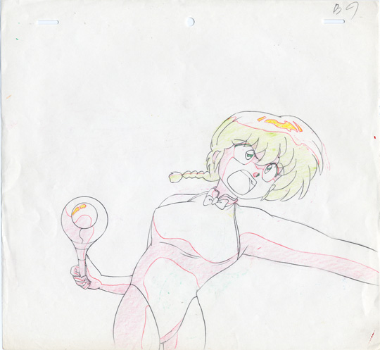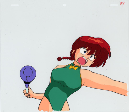 Ranma-chan is in the ring at school fighting the leader of the male rhythmic gymnastics team, Kimiyasu Daitokuji. Here, Ranma-chan is about to throw a punch with a purple juggling club.