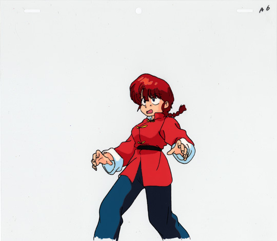 Kuno has lost his memory. Ranma-chan hits him over the head with a watermelon and asks if he has recovered his memory. When he says that he remembers his purpose in going to watermelon island, Ranma-chan starts to back away, as shown in this cel. Akane then hits Kuno over the head with another watermelon and tells Ranma-chan to run.