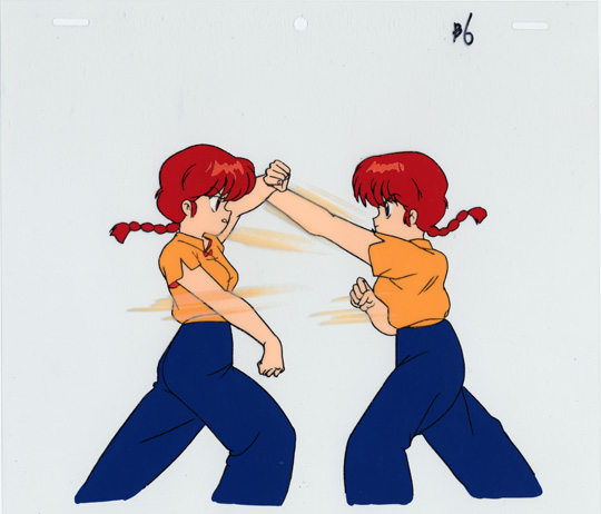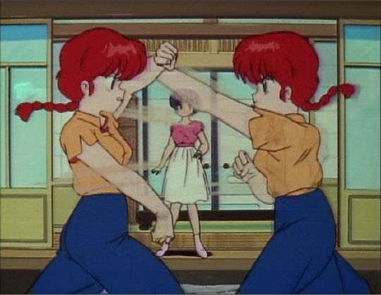 Ranma-chan and Copycat Ken are battling outside the Tendo house. It's the real Ranma-chan on the left.